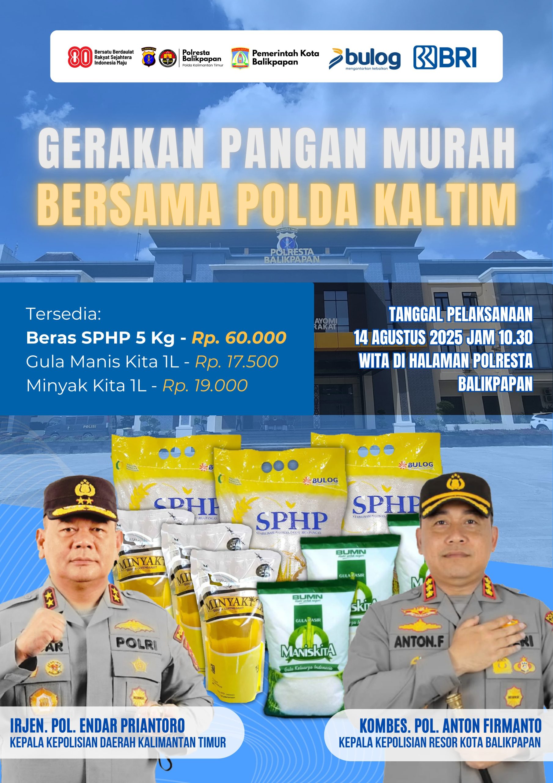 Polda Kalimantan Timur bersama Perum Bulog akan menggelar Gerakan Pangan Murah (GPM) pada Kamis (14/8) di halaman Mako Polresta Balikpapan. Kegiatan ini menyediakan 1.000 paket beras premium berisi 5 kilogram yang dijual seharga Rp60.000 per paket.