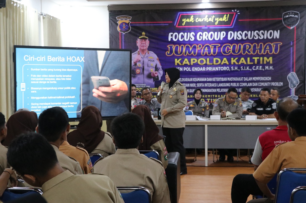Kegiatan dibuka oleh AKBP Qori Kurniawati, S.E. dari Bidang Humas Polda Kaltim yang menyampaikan apresiasi atas keterlibatan aktif pelajar dalam membangun budaya literasi digital yang sehat. Ia juga menekankan pentingnya peran generasi muda dalam menangkal penyebaran informasi palsu atau hoaks yang marak di media sosial.