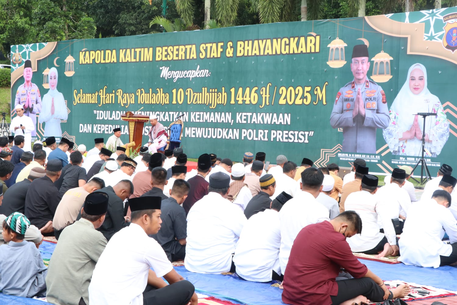 Polda Kalimantan Timur melaksanakan Sholat Idul Adha 1446 Hijriah bersama masyarakat di Halaman Apel Mapolda Kaltim, Jumat pagi (6/6/2025).