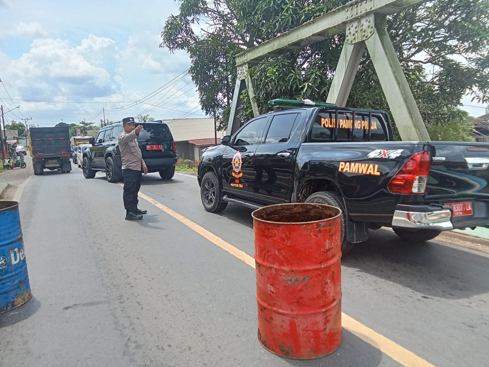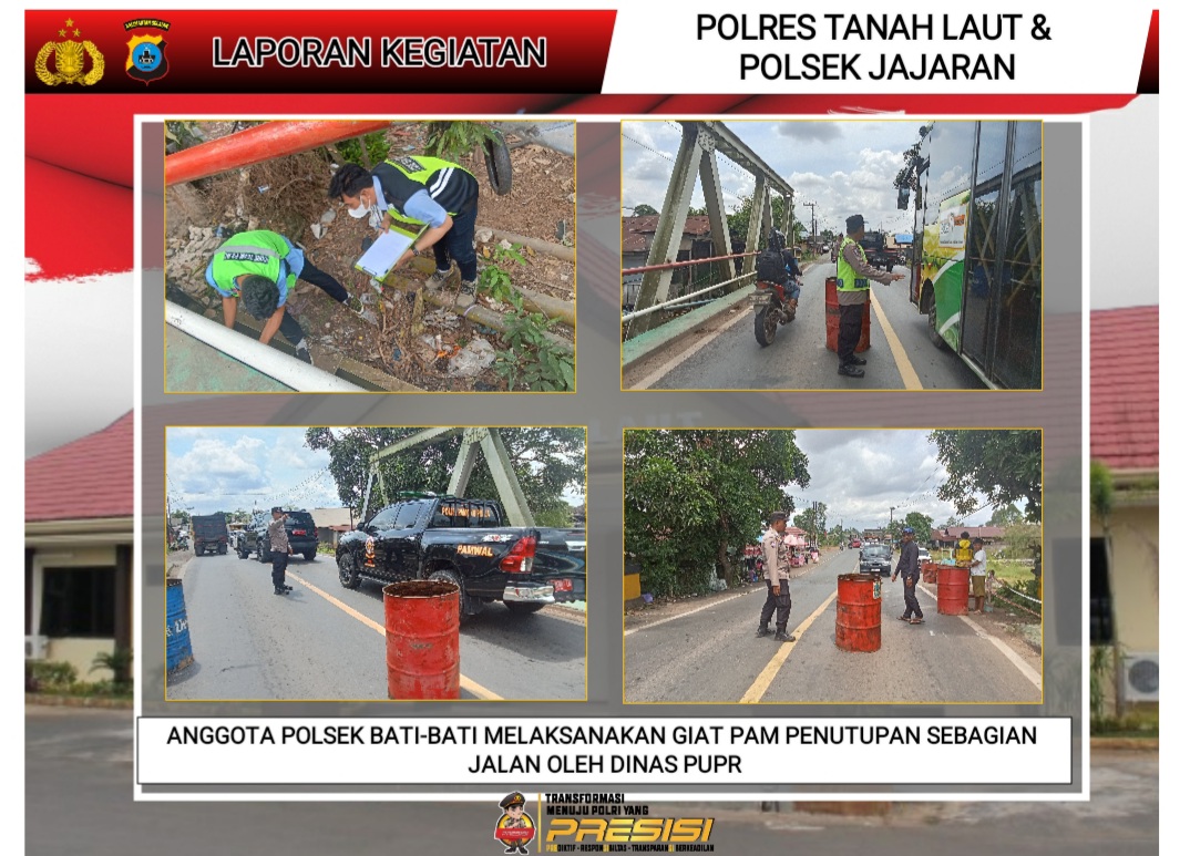 Kepolisian Sektor (Polsek) Bati-Bati turut aktif mengamankan kegiatan penutupan sebagian jalan di jembatan perbatasan Kecamatan Bati-Bati dengan Kecamatan Tambang Ulang, Kabupaten Tanah Laut. Penutupan jalan ini dilakukan oleh Dinas Pekerjaan Umum dan Penataan Ruang (PUPR) Provinsi Kalimantan Selatan pada Rabu (23/4/2025) mulai pukul 13.00 WITA hingga selesai.