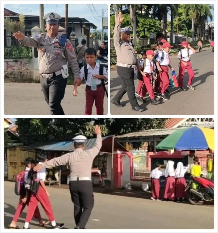 Untuk mencegah terjadinya kecelakaan lalulintas, dan tetap menjaga arus lalulintas lancar, anggota Unit lantas Polsek Kalijati Polres Subang Bripka Boby Topana melaksanakan Gatur penyebrangan anak siswa Siswi SD Negri Satu Kalijati.