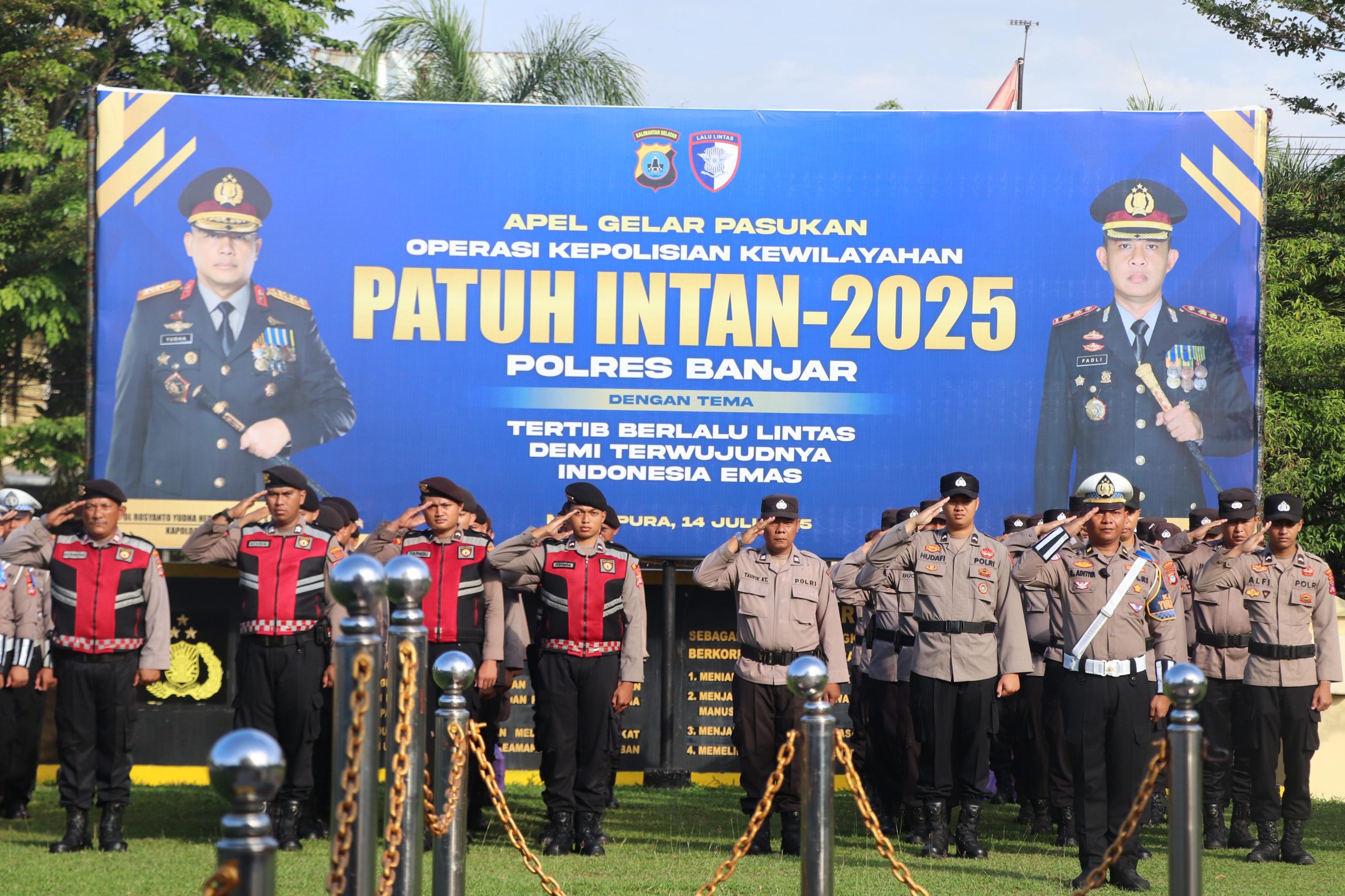 Polres Banjar melaksanakan Apel Gelar Pasukan Operasi Kepolisian Kewilayahan Patuh Intan 2025, Selasa pagi (14/7/2025), di halaman Mapolres Banjar. Apel ini dipimpin Kapolres Banjar AKBP Dr. Fadli dan diikuti Forkopimda Kabupaten Banjar, Wakapolres, perwakilan Kodim 1006 Martapura, Dishub, Satpol PP, serta personel Polres Banjar.