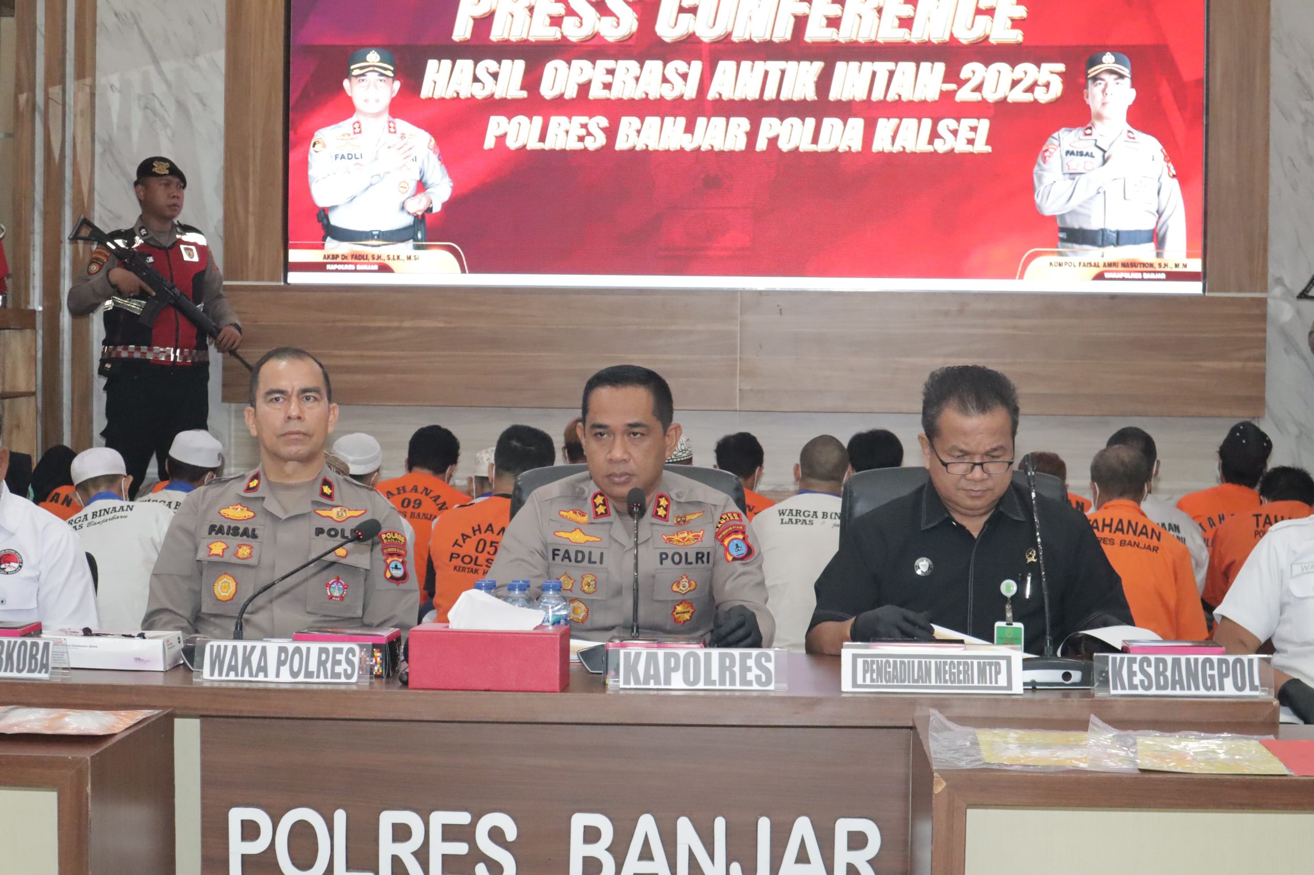Kepolisian Resor Banjar menggelar Press Conference hasil pelaksanaan Operasi Antik Intan 2025, pada Rabu (02/07/2025) pukul 09.00 WITA bertempat di Aula Sarja Arya Racana Polres Banjar. Kegiatan ini dipimpin langsung oleh Kapolres Banjar AKBP Dr. Fadli dan turut dihadiri sejumlah pejabat serta unsur terkait.