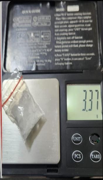 Tim kemudian memberhentikan dan menggeledah pelaku. Dari hasil pemeriksaan, polisi menyita sejumlah barang bukti, yaitu satu paket plastik kecil berwarna merah yang diduga kuat berisi sabu-sabu dengan berat bruto 3,37 gram, satu unit handphone android, satu lembar tisu, dan satu unit sepeda motor yang digunakan pelaku