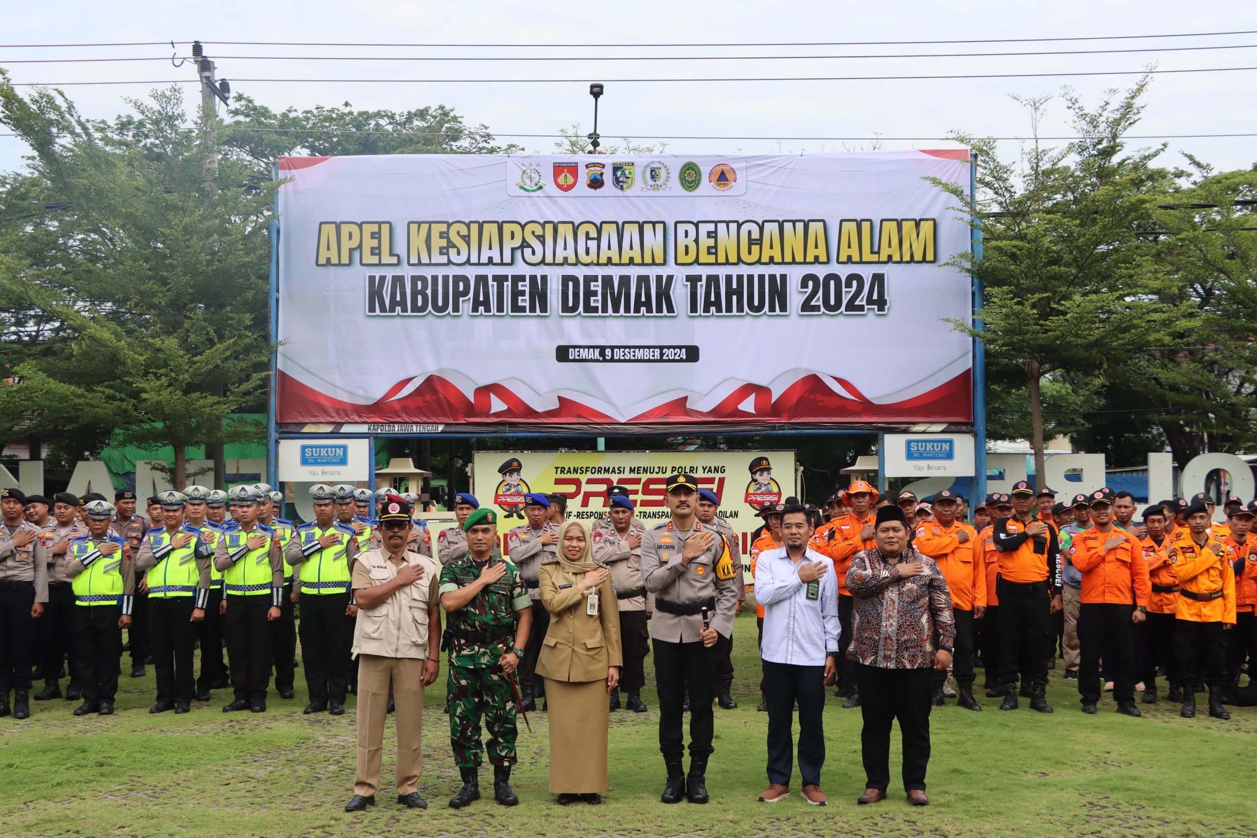 Polres Demak bersama Pemerintah Daerah (Pemda) menggelar Apel Kesiapsiagaan Bencana Alam di Lapangan Wicaksana Laghawa Polres Demak, Senin (9/12/2024).