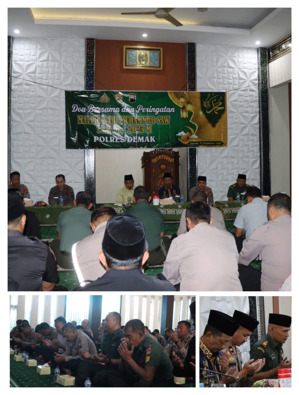 Kepolisian Resor (Polres) Demak, Jawa Tengah, menggelar peringatan Maulid Nabi Muhammad SAW 1447 H di Masjid Uswatun Hasanah, Kamis (11/9/2025). Acara ini tak hanya sebagai wujud peningkatan iman dan takwa, tapi juga menjadi momentum doa bersama untuk menjaga situasi keamanan dan ketertiban masyarakat (Kamtibmas), khususnya pasca-aksi demo di berbagai daerah.