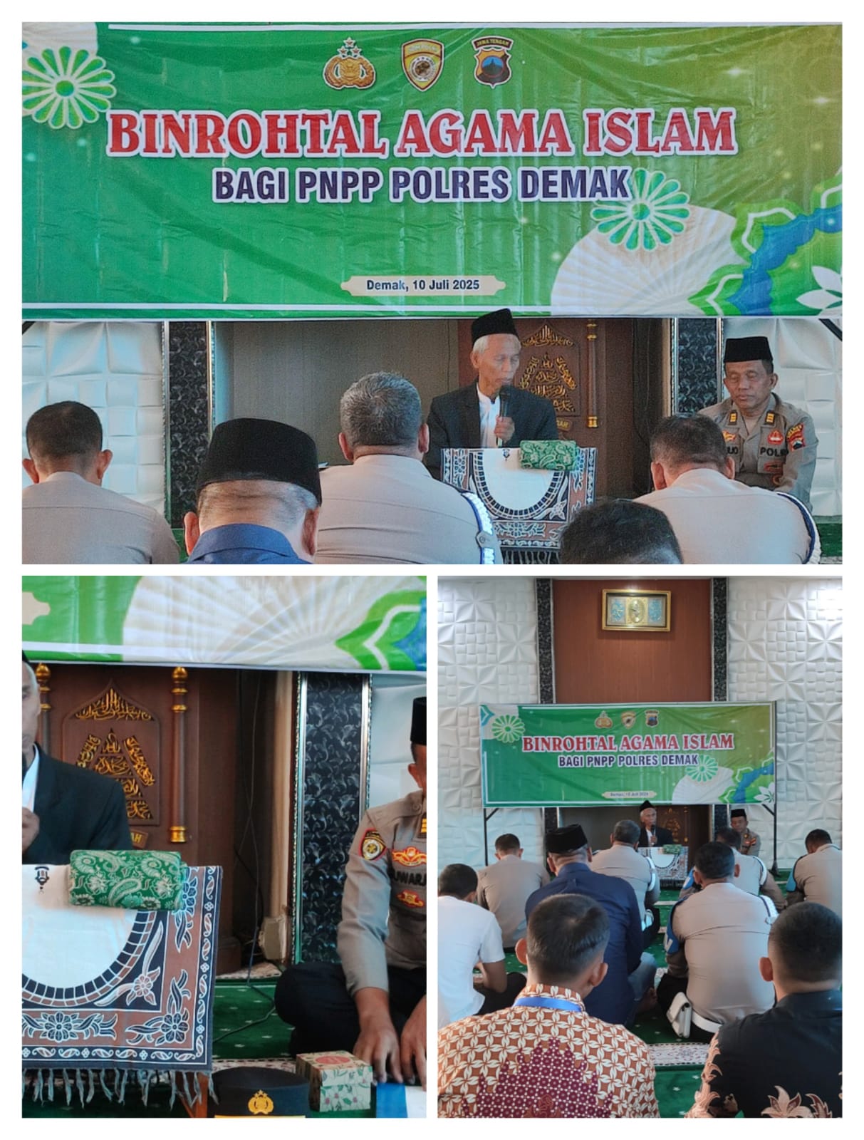 Jajaran Polres Demak menggelar pengajian rutin dalam rangka pembinaan rohani dan mental (Binrohtal) bagi Personel Polri dan Pegawai Negeri Pada Polri (PNPP) di Masjid Uswatun Hasanah, komplek Polres Demak, Kamis (10/7/2025).