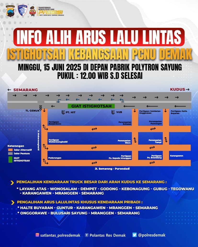 Akan kami lakukan rekayasa lalu lintas atau pengalihan arus di jalur Pantura Demak,” kata Kapolres Demak AKBP Ari Cahya Nugraha, Sabtu (14/6/2025).