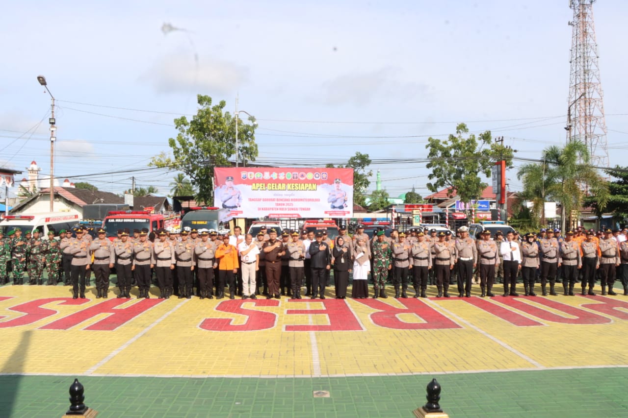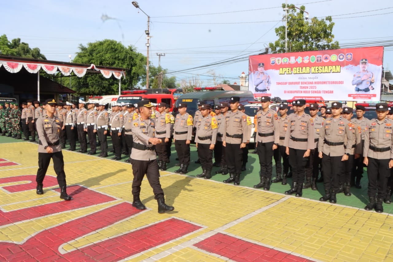Polres Hulu Sungai Tengah Polda Kalimantan Selatan Dalam rangka kesiapsiagaan menghadapi potensi bencana hidrometeorologi yang dapat terjadi akibat perubahan cuaca ekstrem, Kapolres HST AKBP Jupri JHP Tampubolon, S.I.K., M.Si memimpin langsung Apel Gelar Pasukan Kesiapan Tanggap Darurat Bencana Hydrometeorologi yang dilaksanakan di Lapangan Apel Mako Polres HST , Rebu (05/11/2025).