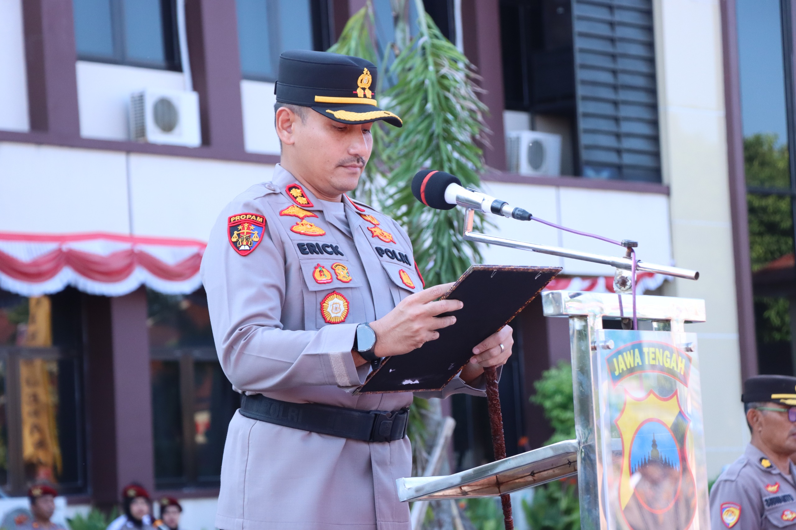 Upacara yang dimulai pukul 07.45 WIB ini dipimpin langsung oleh Kapolres Jepara AKBP Erick Budi Santoso dengan diikuti seluruh personel masing-masing satuan fungsi, termasuk pejabat utama dan Kapolsek jajaran Polres Jepara.