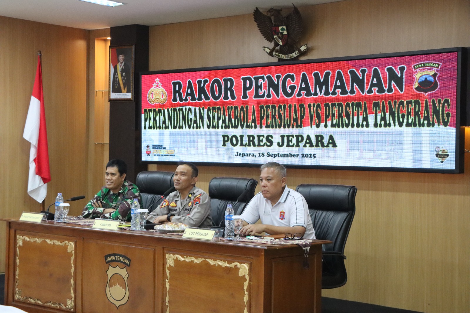 Rapat koordinasi lintas sektor digelar di aula Mapolres Jepara, Kamis (18/9/2025), guna mematangkan skema pengamanan mulai dari dalam stadion hingga titik-titik strategis di luar arena pertandingan.