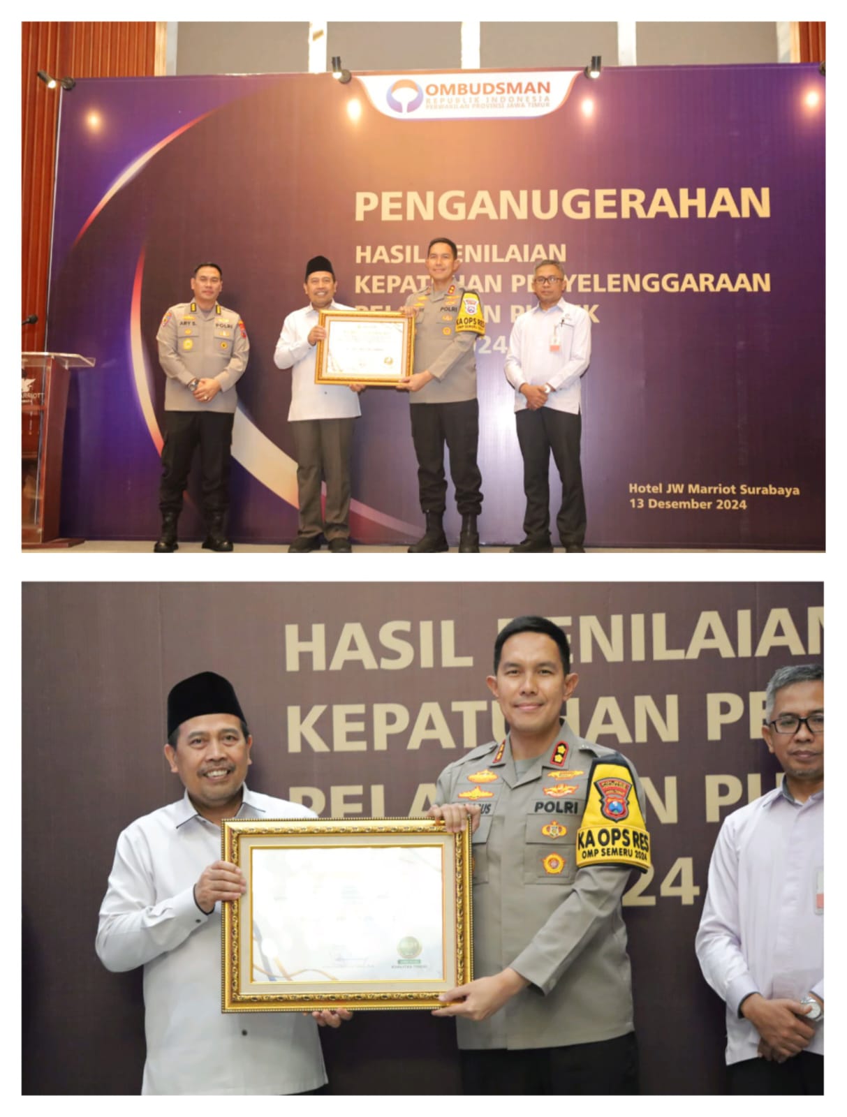Polres Jombang menerima penghargaan dari Ombudsman Republik Indonesia dalam acara Penganugerahan Predikat Kepatuhan Penyelenggaraan Pelayanan Publik 2024 bertempat di Hotel JW Marriott Surabaya, Jum’at (13/12).