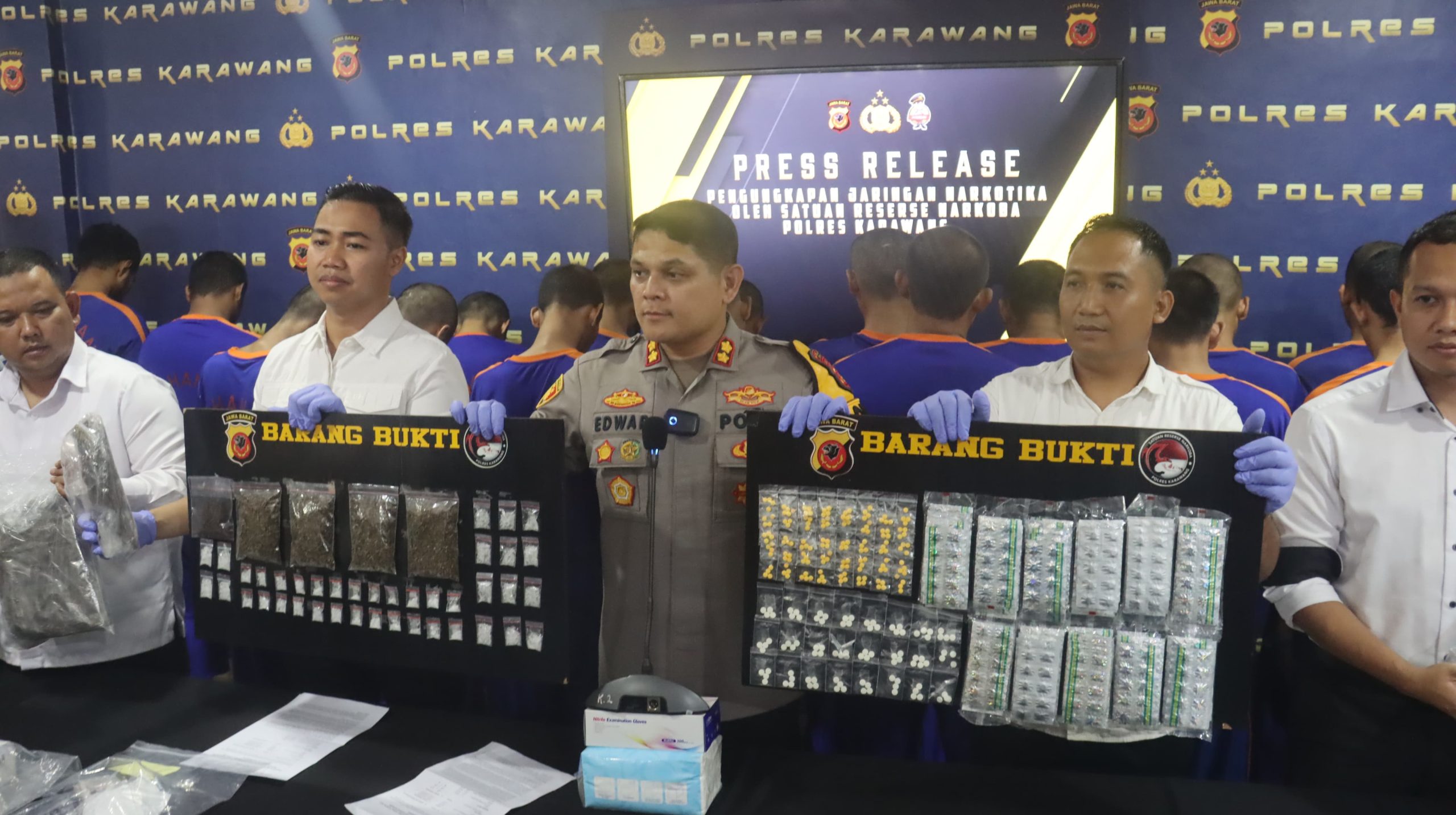 Kapolres karawang AKBP Edwar Zulkarnain dalam konferensi persnya menyampaikan ada sebanyak 18 kasus dg total 23 tersangka di amankan. 13 kasus dengan 17 tersangka kasus narkotika sabu,ganja dan tembakau sintetis, sedangkan 5 kasus OKT dengan 6 orang tersangka”ujar kapolres senin 4 november 2024.