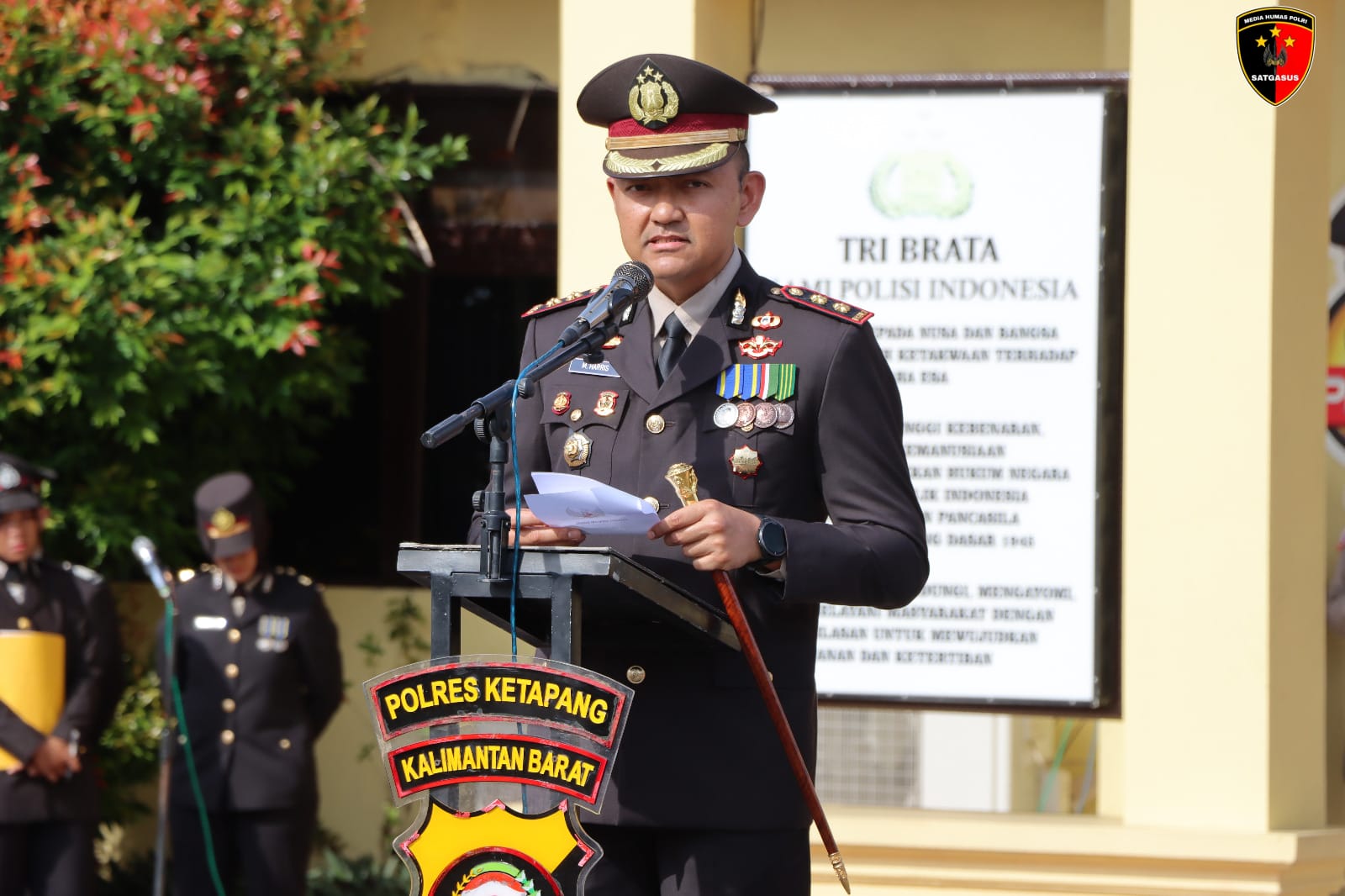 Kapolres Ketapang AKBP Muhammad Harris, S.H., S.I.K., M.I.K., CPHR. memimpin langsung jalannya upacara yang diikuti oleh para Pejabat Utama Polres, personel Polri,serta ASN Polres Ketapang.
