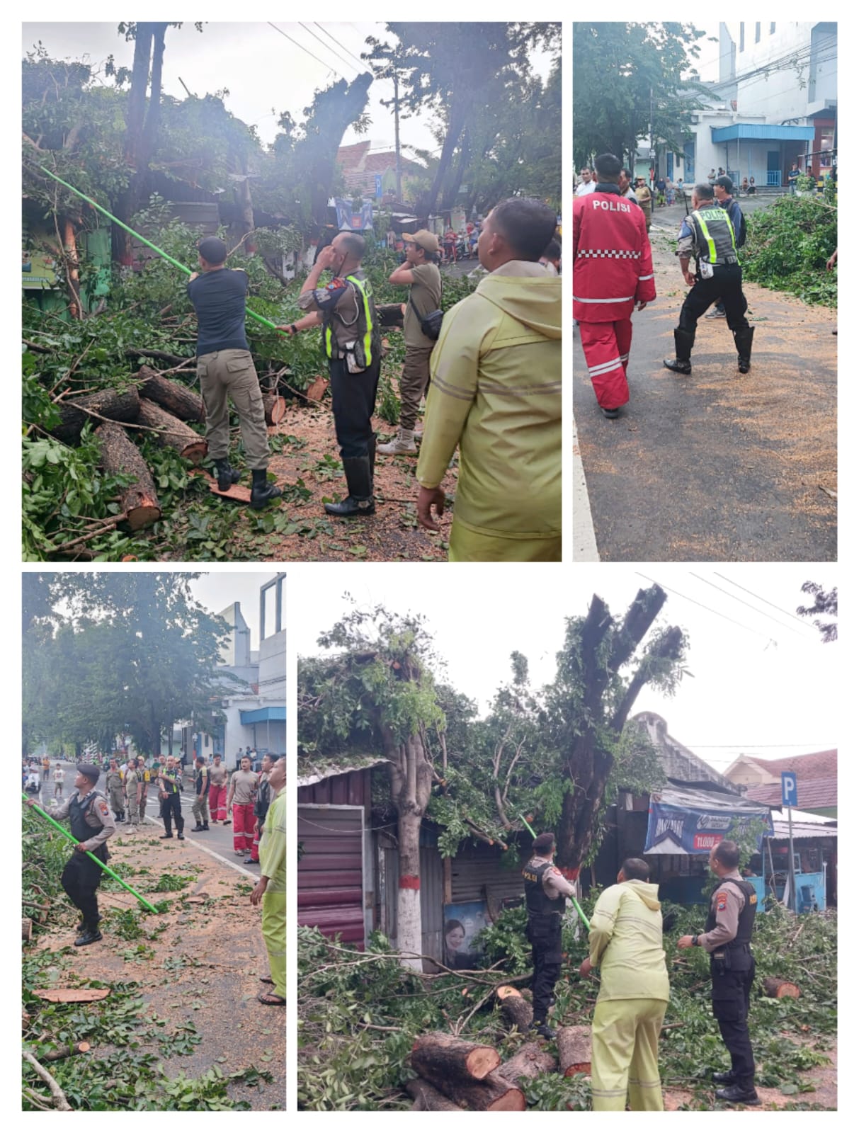 Sebagai bentuk respon cepat, Polres Mojokerto Kota bersama TNI, BPBD, DLH, relawan dan masyarakat setempat bergerak cepat dengan melakukan evakuasi pohon tumbang.