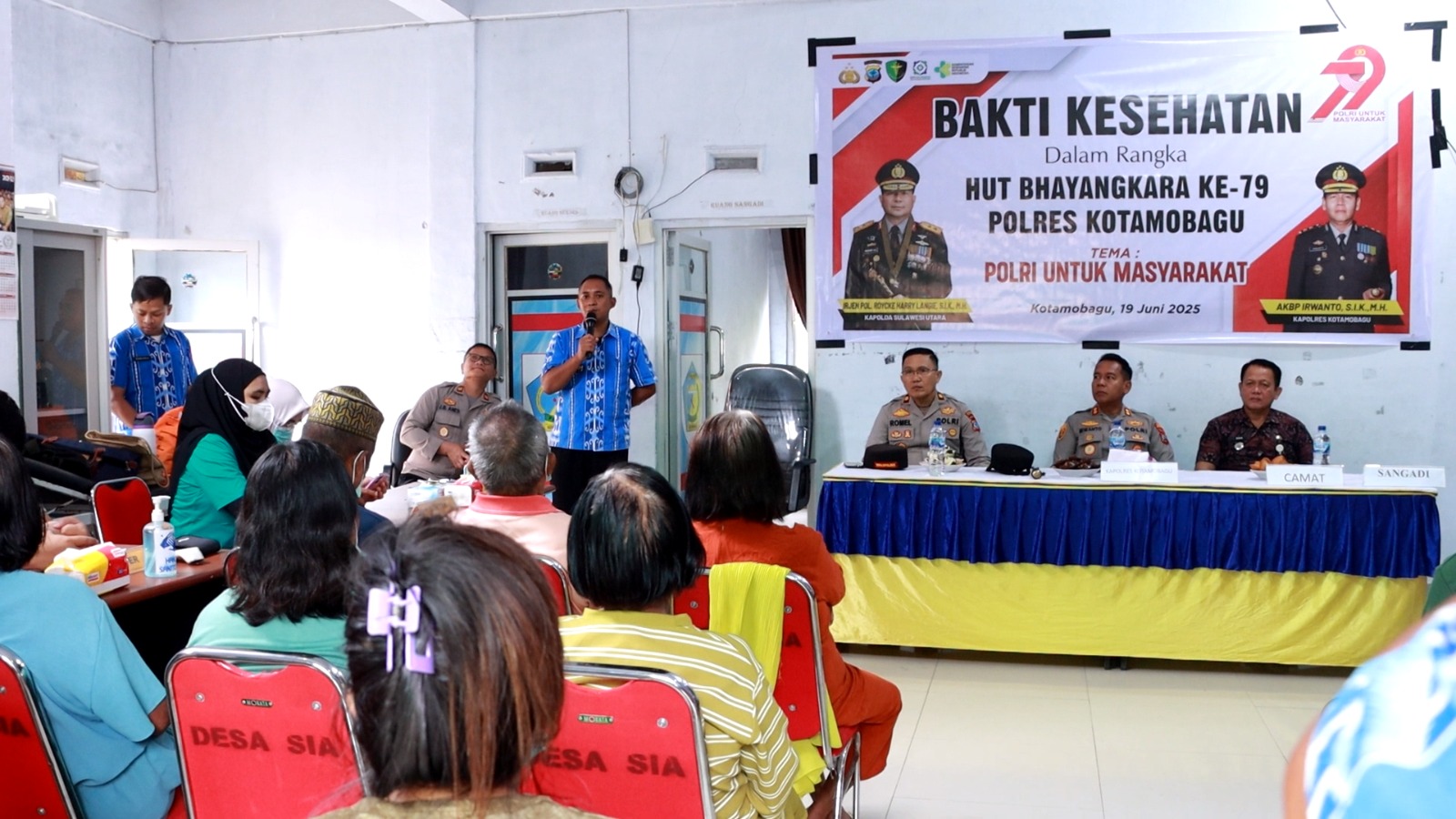 Dalam rangka hari ulang tahun Bhayangkara ke-79, Polres Kotamobagu menggelar Bakti Kesehatan di Desa Sia Kecamatan Kotamobagu Utara pada Kamis, (19/6/2025).