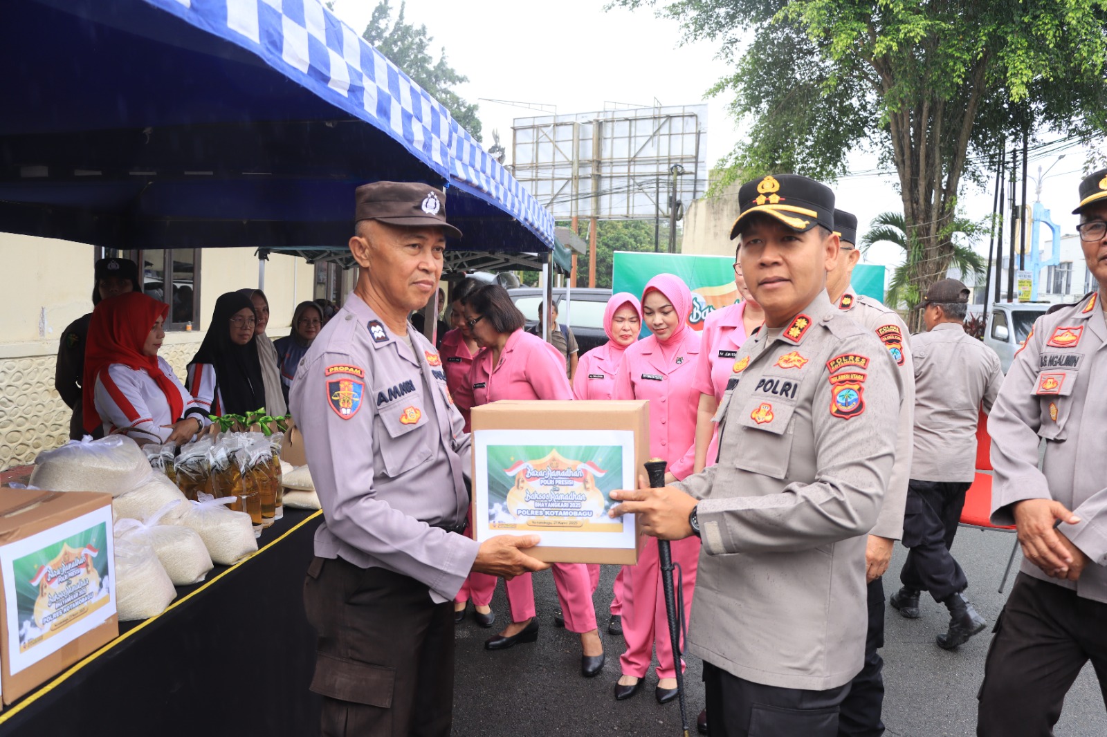 Humas Polres Kotamobagu Sejumlah personil Polres Kotamobagu mengantri Sembako di depan Mapolres Kotamobagu jalan Ahmad Yani Kotamobagu dalam kegiatan Bazar Ramadhan Polri Presisi dan Bakti Sosial Ramadhan Bhayangkari 2025, Jumat (21/3/2025).
