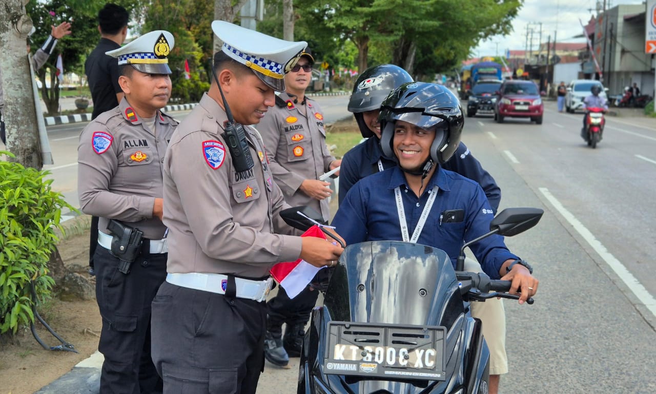 Dalam rangka menyambut Hari Ulang Tahun (HUT) ke-80 Kemerdekaan Republik Indonesia, Polres Kutai Kartanegara menggelar aksi pembagian Bendera Merah Putih dan bunga kepada para pengendara kendaraan bermotor yang melintas di simpang empat lampu merah Jalan KH. Ahmad Muksin, Kelurahan Timbau, Kecamatan Tenggarong, Selasa (5/8/2025) sekitar pukul 13.20 WITA..