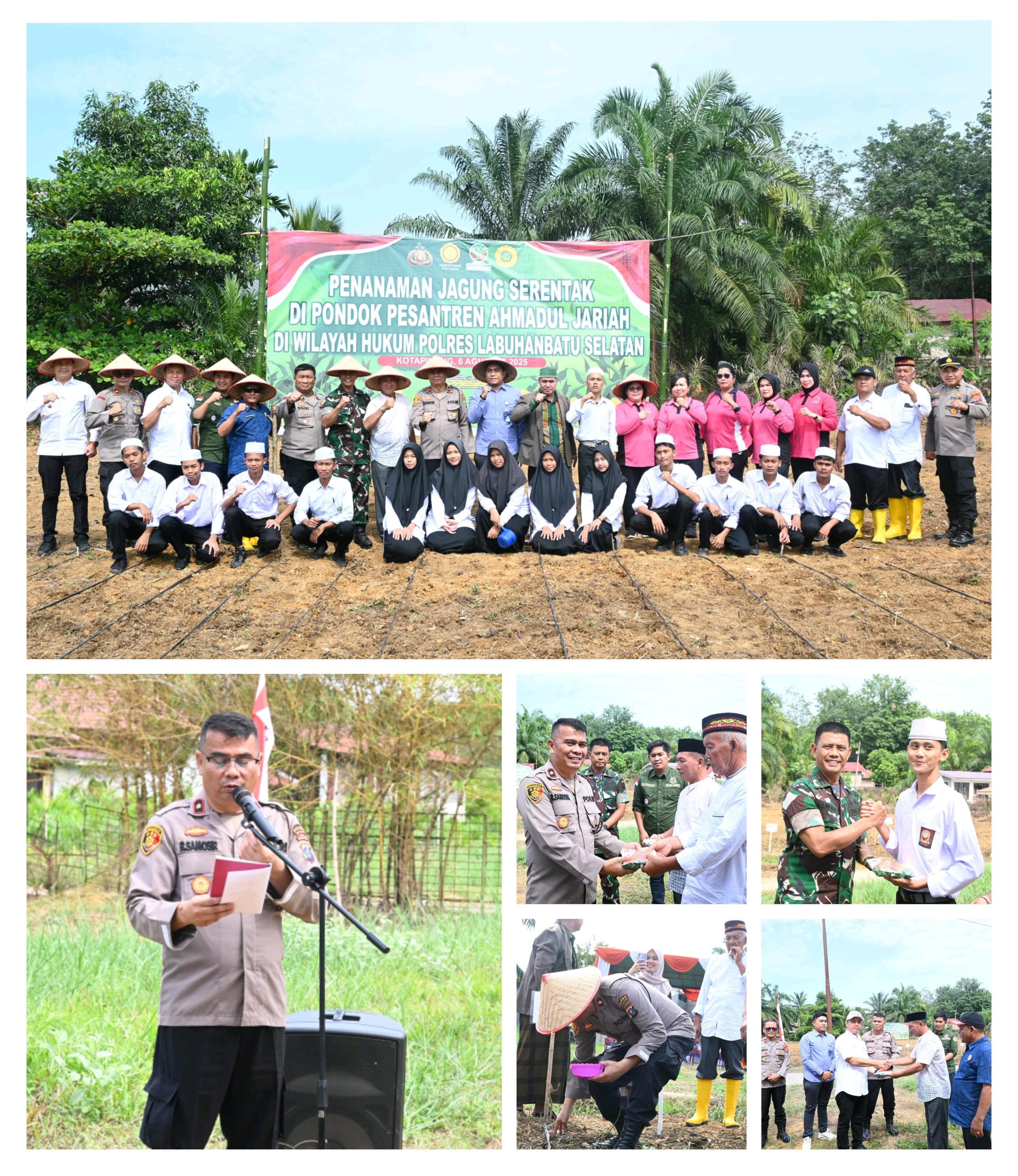 Dalam upaya mendukung ketahanan pangan dan mempererat sinergitas lintas sektor, Polres Labuhanbatu Selatan bersama Forum Komunikasi Pimpinan Daerah (Forkopimda) melaksanakan kegiatan penanaman jagung secara serentak di Pondok Pesantren (Ponpes) Ahmadul Jariah, Kecamatan Kotapinang, Kabupaten Labuhanbatu Selatan, Rabu (6/8/2025).