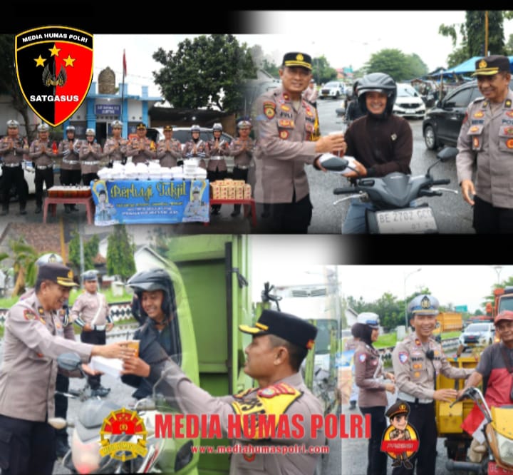 Pemandangan di Jalan Lintas Tengah Sumatera, tepatnya di simpang Tugu Pepadun tampak ramai oleh anggota Kepolisian dari jajaran Polres Lampung Tengah, Polda Lampung yang membagikan takjil untuk masyarakat jelang berbuka puasa, Selasa (4/3/25) pukul 17.00 WIB.