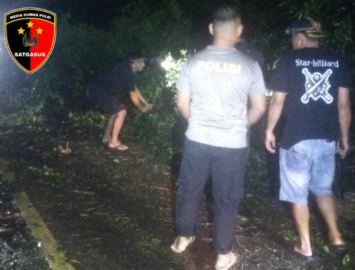 Kapolres Melawi, AKBP Muhammad Syafi’i, S.I.K., S.H., M.H melalui Karendal Ops Lilin Kapuas 2024 membenarkan adanya pohon tumbang yang menutupi ruas jalan, sabtu (21/12/24) malam.