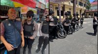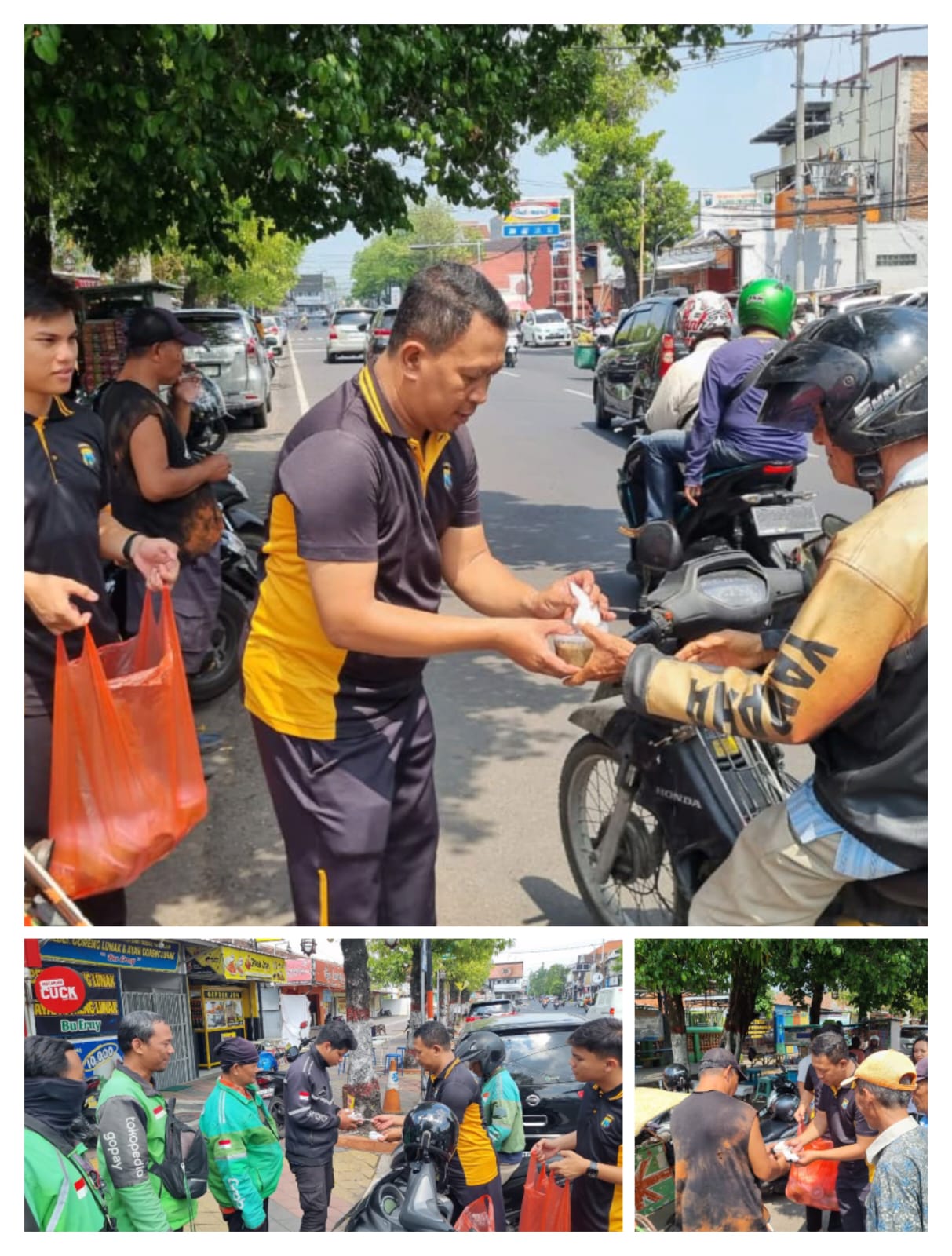 Personel Polres Mojokerto Kota melalui Bag SDM membagikan puluhan bubur kacang hijau ke tukang becak dan masyarakat di sekitar Stasiun Mojokerto pada Sabtu (20/09/2025).