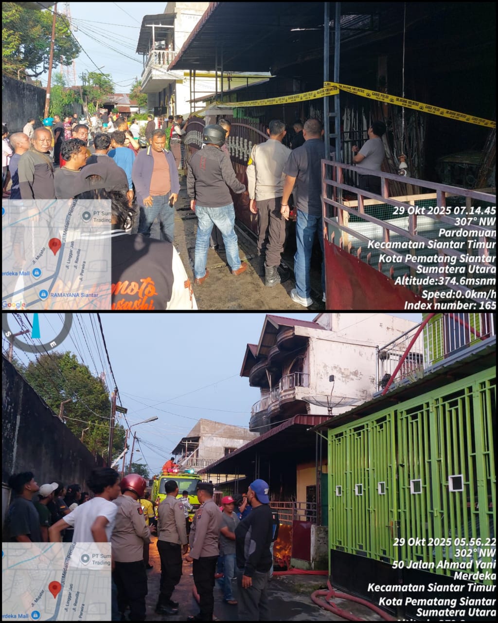Polres Pematangsiantar melalui personil Piket SPKT dan Satfung beserta piket Polsek Sianțar Timur respon cepat melakukan pengecekan Tempat Kejadian Perkara (TKP) kebakaran satu unit rumah warga di Jalan Ahmad Yani Gang Udang Kelurahan Pardomuan Kecamatan Siantar Timur Kota Pematangsiantar, pada hari Rabu 29 Oktober 2025 pagi subuh sekira pukul 04.00 Wib.
