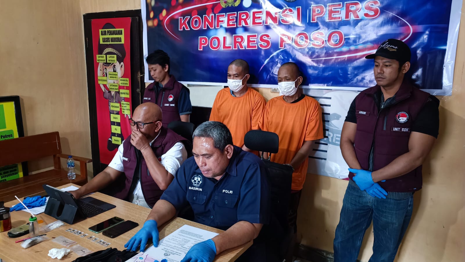 Polres Poso melalui Satresnarkoba berhasil mengungkap kasus narkoba dengan mengamankan dua tersangka, Lk. B dan Lk. N Konferensi pers yang dipimpin oleh Kasi Humas AKP Basirun Laele,S.Sos dan KBO Narkoba Polres Poso IPDA Risman ini digelar untuk memaparkan hasil pengungkapan kasus narkoba tersebut.