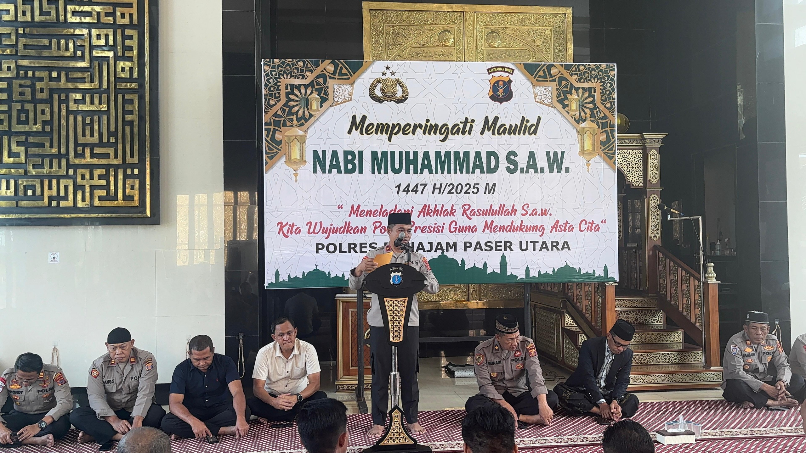 Jajaran Polres Penajam Paser Utara (PPU) menggelar peringatan Maulid Nabi Muhammad SAW dengan penuh khidmat di Masjid Polres PPU, Kamis 4/9/2025). Kegiatan tersebut mengusung tema “Teladani Akhlak Rasulullah SAW, Kita Wujudkan Polri Presisi Guna Mendukung Asta Cita”.