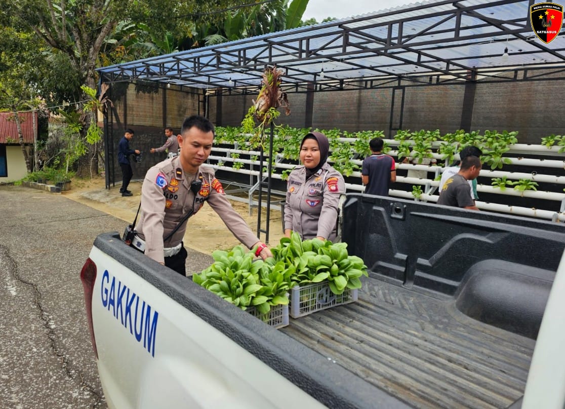 Polres Sekadau melalui Satuan Lalu Lintas memanen sayuran hidroponik jenis Pakcoy yang ditanam di lingkungan Mako Polres Sekadau dan membagikannya ke Pondok Pesantren Al Fatah, di Jalan Merdeka Timur, Km 4, Desa Mungguk, Kecamatan Sekadau Hilir, Rabu (25/6/2025).