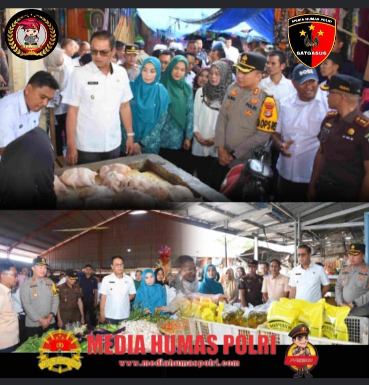 Menjelang Hari Raya Idul Fitri, Polres Tubaba Polda Lampung bersama Forum Koordinasi Pimpinan Daerah (Forkopimda) Lampung Barat melakukan pengecekan harga dan ketersediaan sembako di Pasar Mulya Asri Kecamatan Tulang Bawang Tengah Kabupaten Tulang Bawang Barat, Rabu (26/03/2025) Pagi