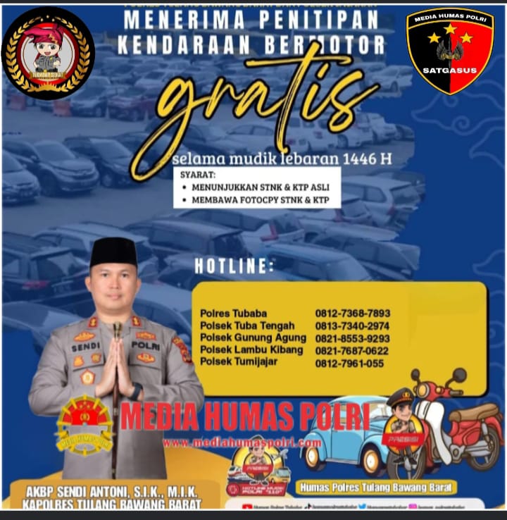 “Kami ingin memastikan masyarakat dapat mudik dengan tenang tanpa khawatir akan keamanan kendaraan atau barang berharganya. Oleh karena itu, kami menyediakan tempat penitipan yang aman di Polres maupun di Polsek Jajaran Polres Tubaba,” ujar AKBP Sendi Antoni, S.I.K.,M.I.K, Kamis (27/3/2025).
