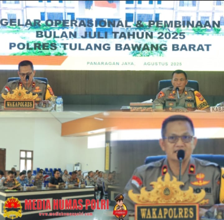 Kapolres Tubaba AKBP Sendi Antoni, S.I.K., M.I.K. melalui Wakapolres Kompol Zaini Dahlan, S.H ,M.H. Pimpin langsung pelaksanaan Gelar Operasional (GO) dan Pembinaan Anev Situasi Kamtibmas untuk bulan Juli 2025, Kegiatan tersebut berlangsung di Aula Sarja Arya Racana Mapolres Tubaba, Selasa (12/08/2025) pagi.