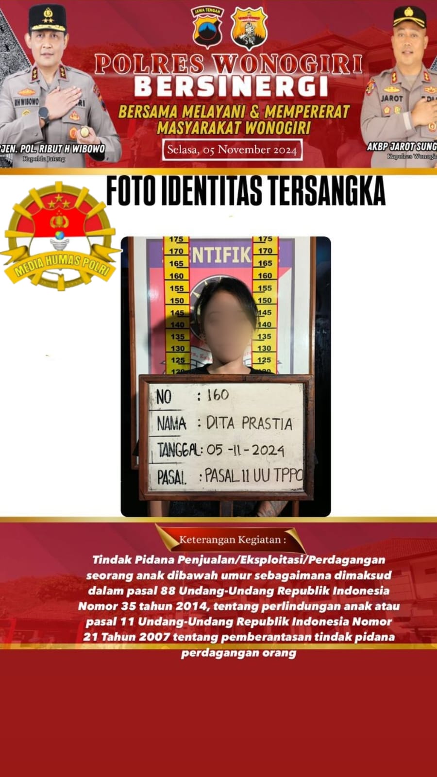 Polres Wonogiri berhasil mengungkap kasus tindak pidana perdagangan orang (TPPO) yang melibatkan seorang perempuan berinisial DP alias Mami Nina (26), warga Kecamatan Jatipurno. Pelaku diduga menjual seorang anak di bawah umur kepada pria hidung belang.