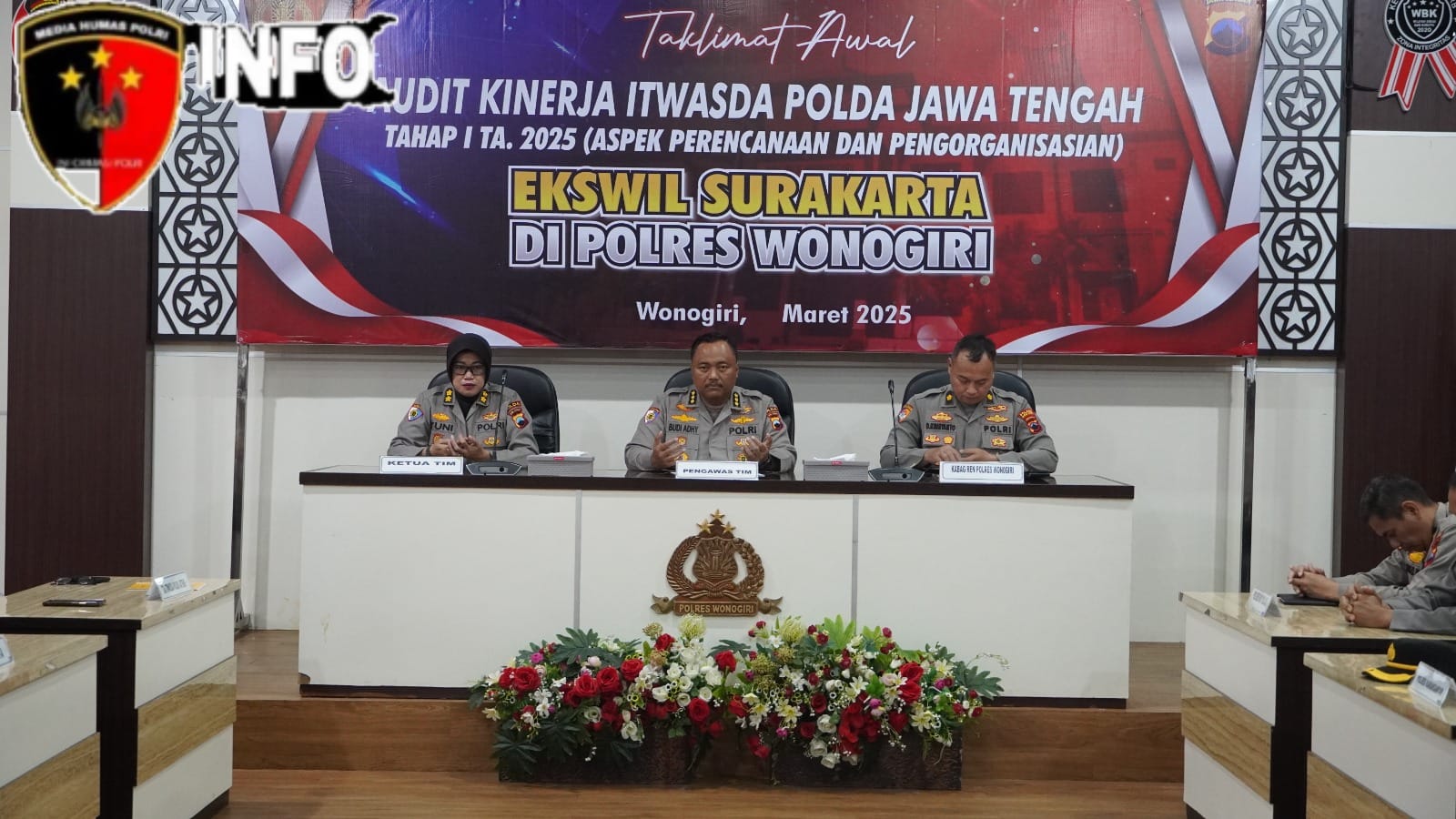 Polres Wonogiri terima kunjungan dari Itwasda Polda Jateng dalam rangka Taklimat awal Audit Kinerja Tahap I Aspek Perencanaan Dan Pengorganisasian T.A. 2025 di Ruang Aula Sanika Satyawada Polres Wonogiri. Senin (3/3/2025).