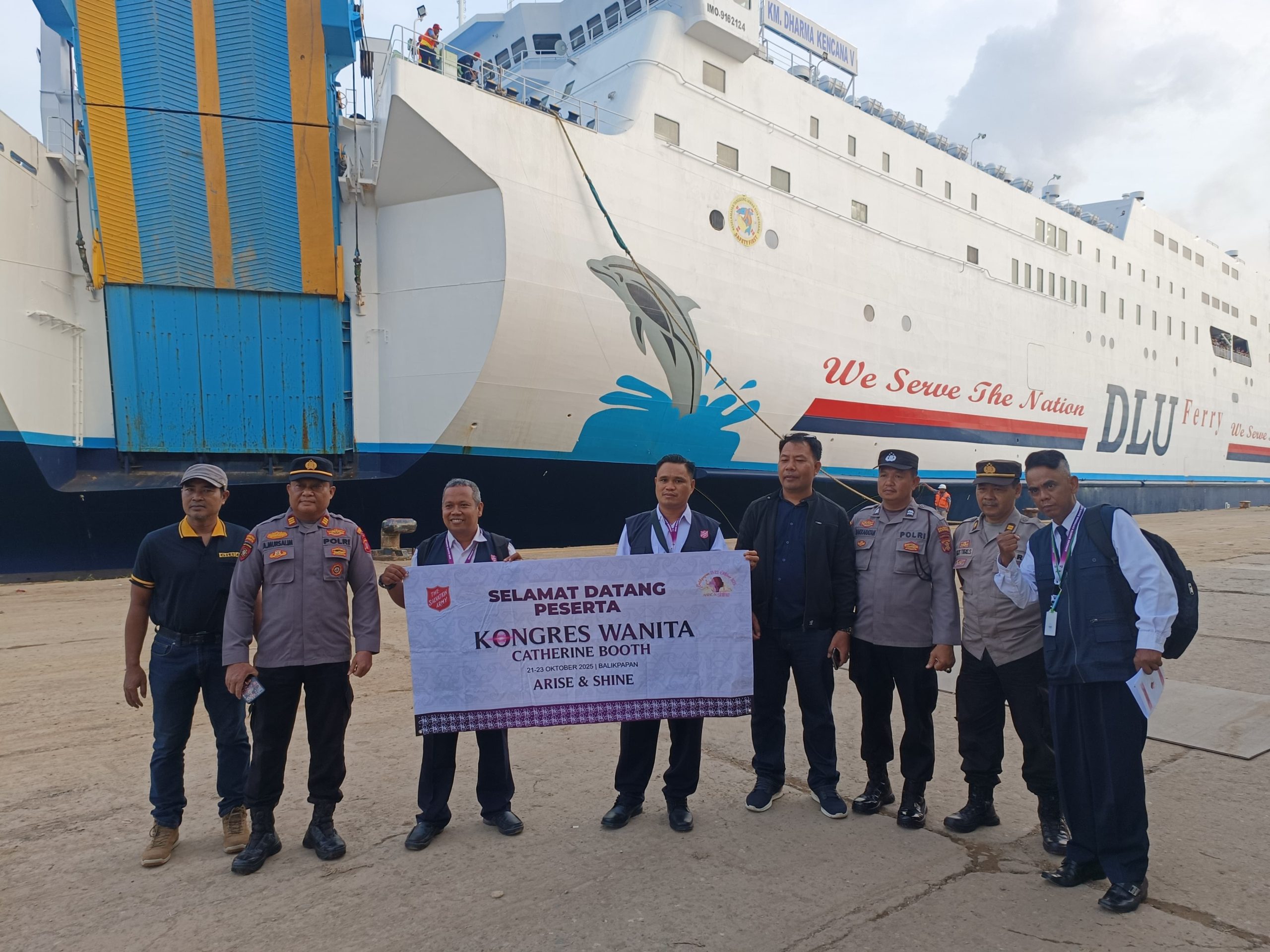 Jajaran Polresta Balikpapan melalui personel gabungan Polsekwas Pelabuhan Semayang melaksanakan pengamanan kedatangan peserta Kongres Wanita Catherine Booth Bala Keselamatan Indonesia Tahun 2025 yang tiba di Pelabuhan Semayang, Senin (20/10/2025) dini hari.