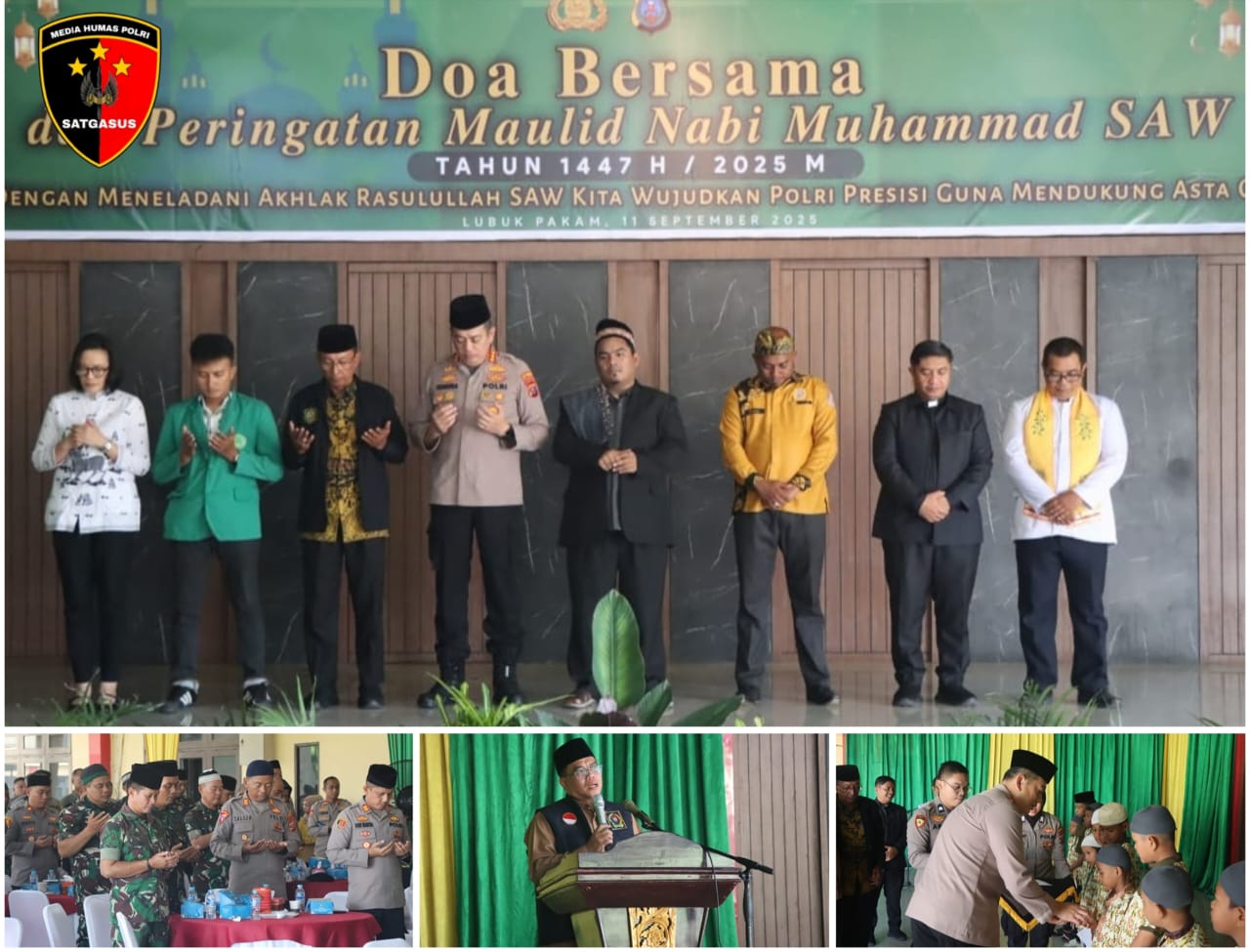 Polresta Deli Serdang menggelar peringatan Maulid Nabi Muhammad SAW 1447 Hijriah yang dirangkai dengan Doa bersama untuk keselamatan bangsa Indonesia, Kamis (11/09/2025).