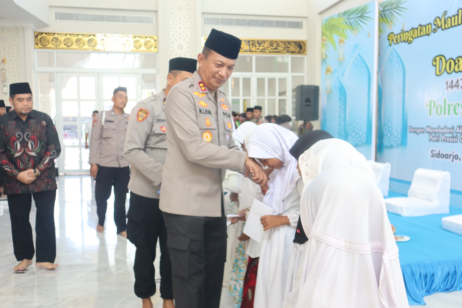 Polisi merayakan Maulid Nabi Muhammad SAW 1447 H di Masjid Al Ikhlas Polresta Sidoarjo, Rabu (11/9/2025). Kegiatan yang diikuti Wakapolresta Sidoarjo AKBP Muhammad Zainur Rofik, anggota dan ASN ini di isi pembacaan shalawat Nabi, pengajian agama, doa bersama serta pemberian santunan kepada anak yatim piatu.