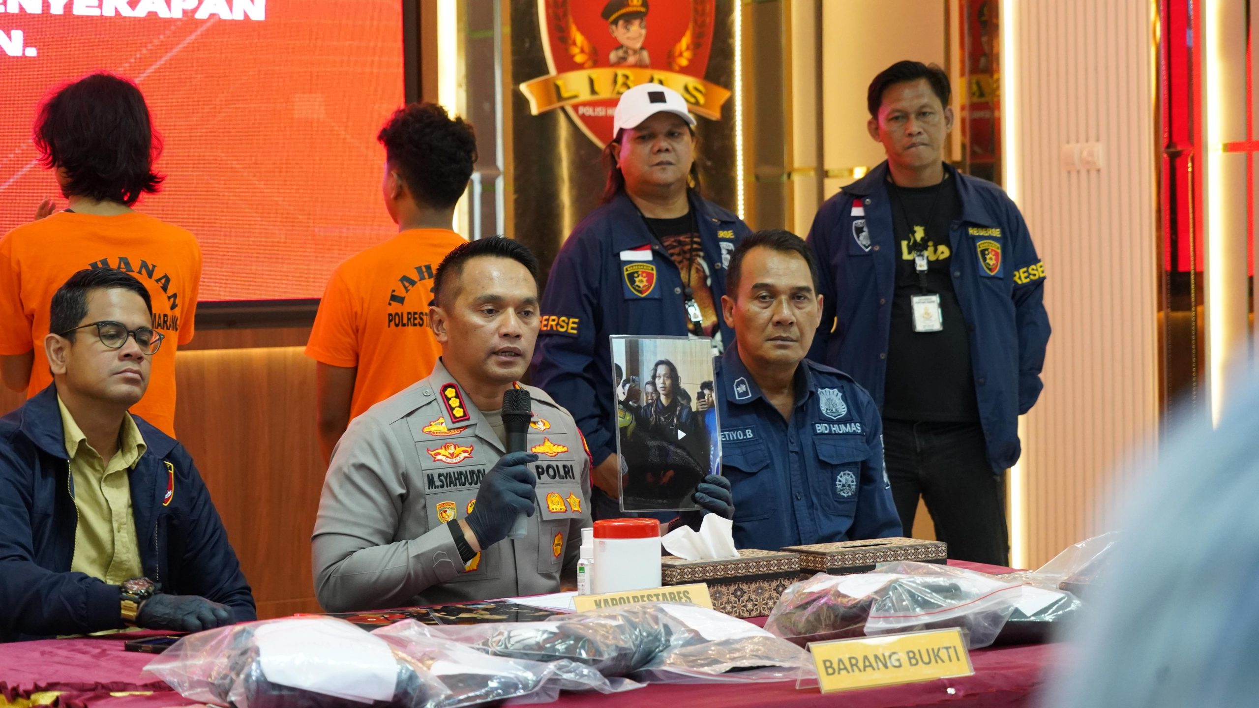 Polrestabes Semarang menggelar konferensi pers pengungkapan kasus tindak pidana penyanderaan dan tindak kekerasan terhadap seorang anggota Polri yang terjadi pada saat aksi Mayday hari Kamis tanggal 1 Mei 2025 di kawasan Jl. Imam Bardjo SH Kelurahan Pleburan Kecamatan Semarang Selatan Kota Semarang.