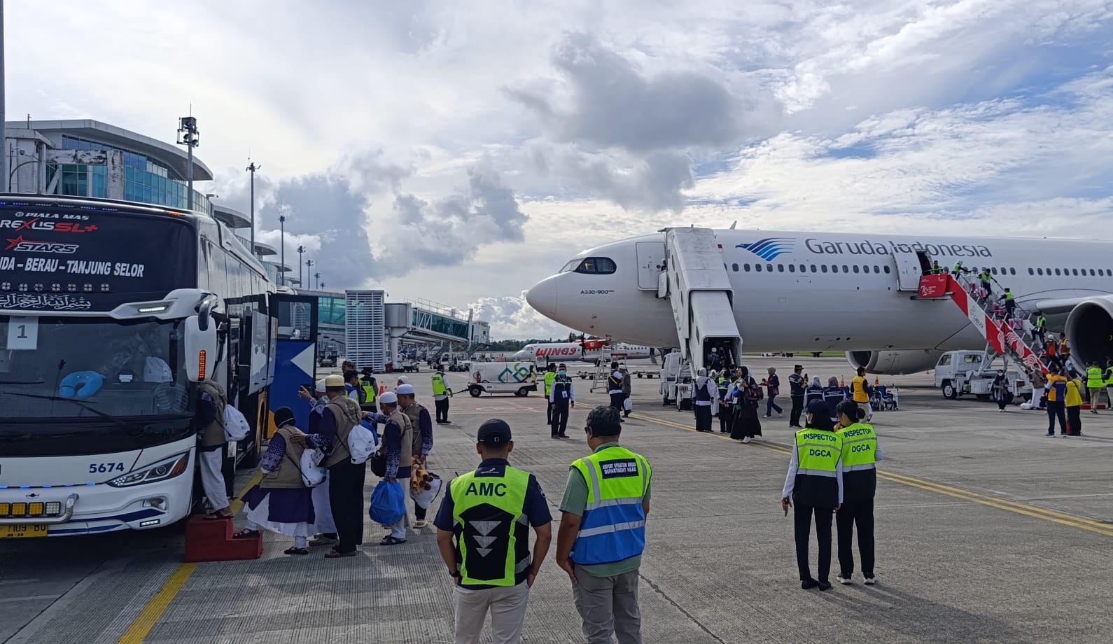 Sebelum pendaratan, pukul 08.28 WITA, 10 unit bus telah masuk ke area airside bandara melalui Posko Perimeter (Main Gate) dan standby di area Fire Station lama. Setelah pesawat mendarat dan parkir, proses debarkasi dilaksanakan dengan tertib. Jamaah turun dari pesawat dan langsung menaiki bus untuk diantar menuju Asrama Haji Batakan Balikpapan guna menjalani proses registrasi dan sterilisasi.