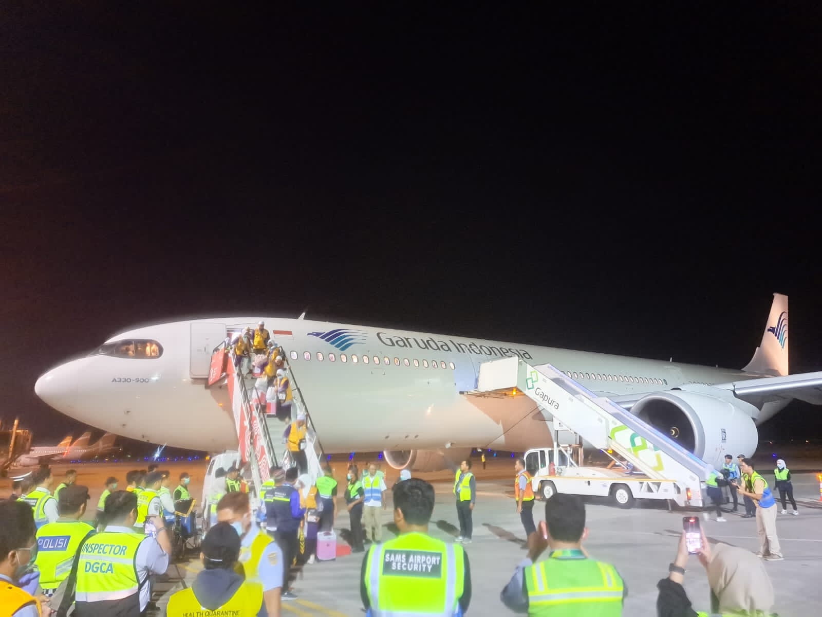 Pukul 23.24 WITA: Jamaah turun dari pesawat, disambut dengan pengalungan syal oleh CEO Regional VI PT Angkasa Pura Indonesia dan jajaran.