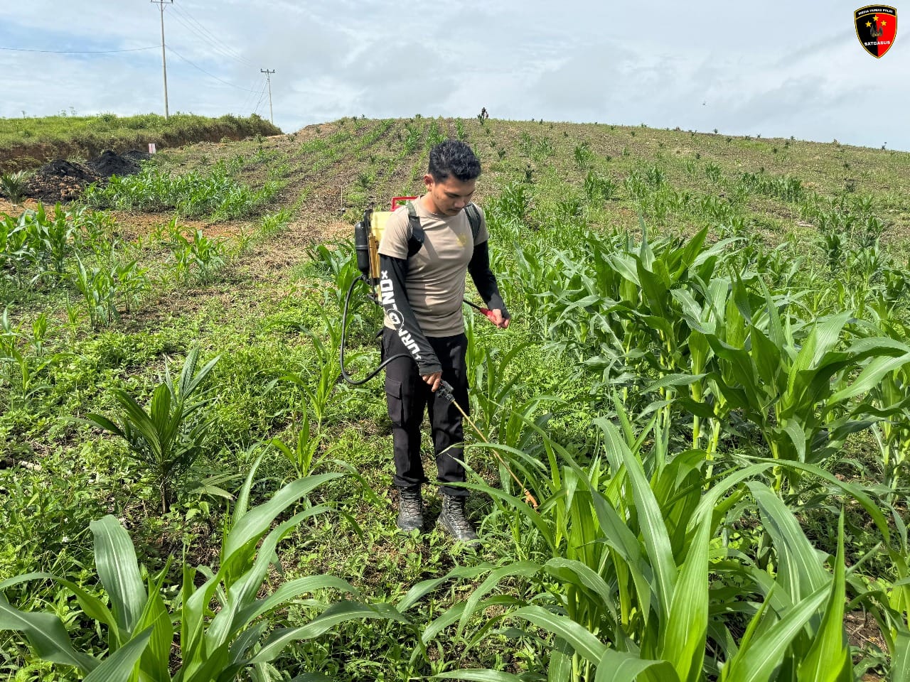IPDA Budi menjelaskan, bahwa penyemprotan ini adalah bagian dari upaya perawatan rutin tanaman jagung hibrida agar tumbuh subur dan menghasilkan panen yang maksimal.