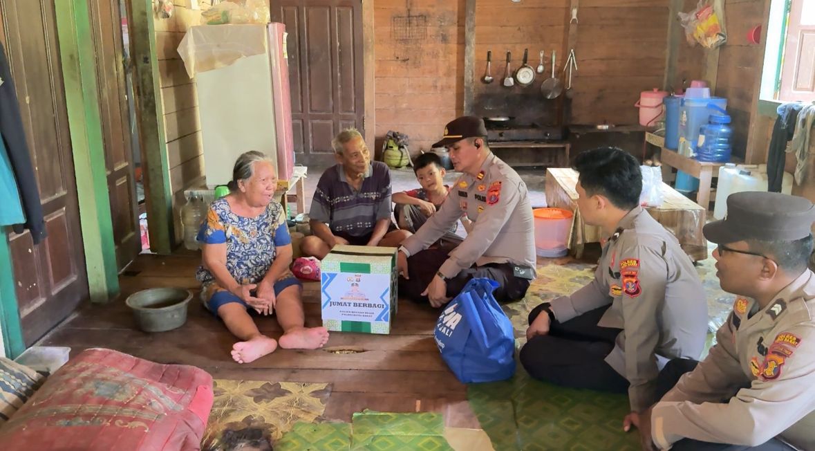 Polsek Bentian Besar melaksanakan kegiatan *“Jumat Berbagi”* sebagai bentuk kepedulian terhadap masyarakat yang membutuhkan, Jumat (10/10/2025) pukul 11.00 Wita. Kegiatan tersebut dipimpin langsung oleh Kapolsek Bentian Besar *Iptu Nelson Eddy Bojoh, S.H., M.H.*, dengan menyambangi kediaman pasangan lansia, Bapak Obet dan Ibu Rempai, di RT 05 Kampung Dilang Puti, Kecamatan Bentian Besar. Kegiatan ini dilakukan setelah adanya informasi dari Ketua RT 05, Sdr. Mabon, yang menyampaikan bahwa pasangan lansia tersebut tengah menderita sakit, bahkan Ibu Rempai hanya bisa terbaring di tempat tidur. Menindaklanjuti hal tersebut, Kapolsek bersama anggota Polsek Bentian Besar mendatangi rumah warga tersebut untuk memberikan bantuan sosial berupa paket sembako.