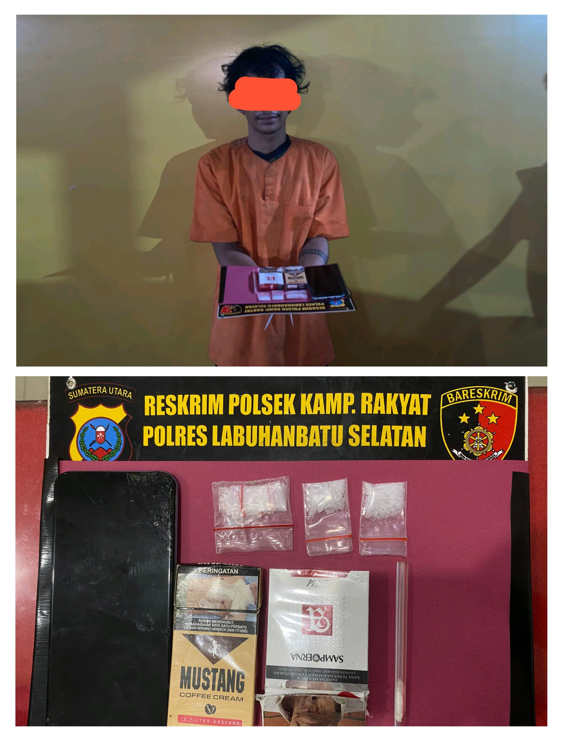 Satuan Reskrim Polsek Kampung Rakyat di bawah jajaran Polres Labuhanbatu Selatan kembali menunjukkan komitmennya dalam memberantas peredaran narkotika di wilayah hukumnya. Seorang pria berinisial MNH alis Udin (25) warga Dusun VI Sidodadi, Desa Perkebunan Teluk Panji, Kecamatan Kampung Rakyat, berhasil diringkus petugas bersama barang bukti narkotika jenis sabu seberat 1,86 gram pada Minggu (12/10/2025) malam.