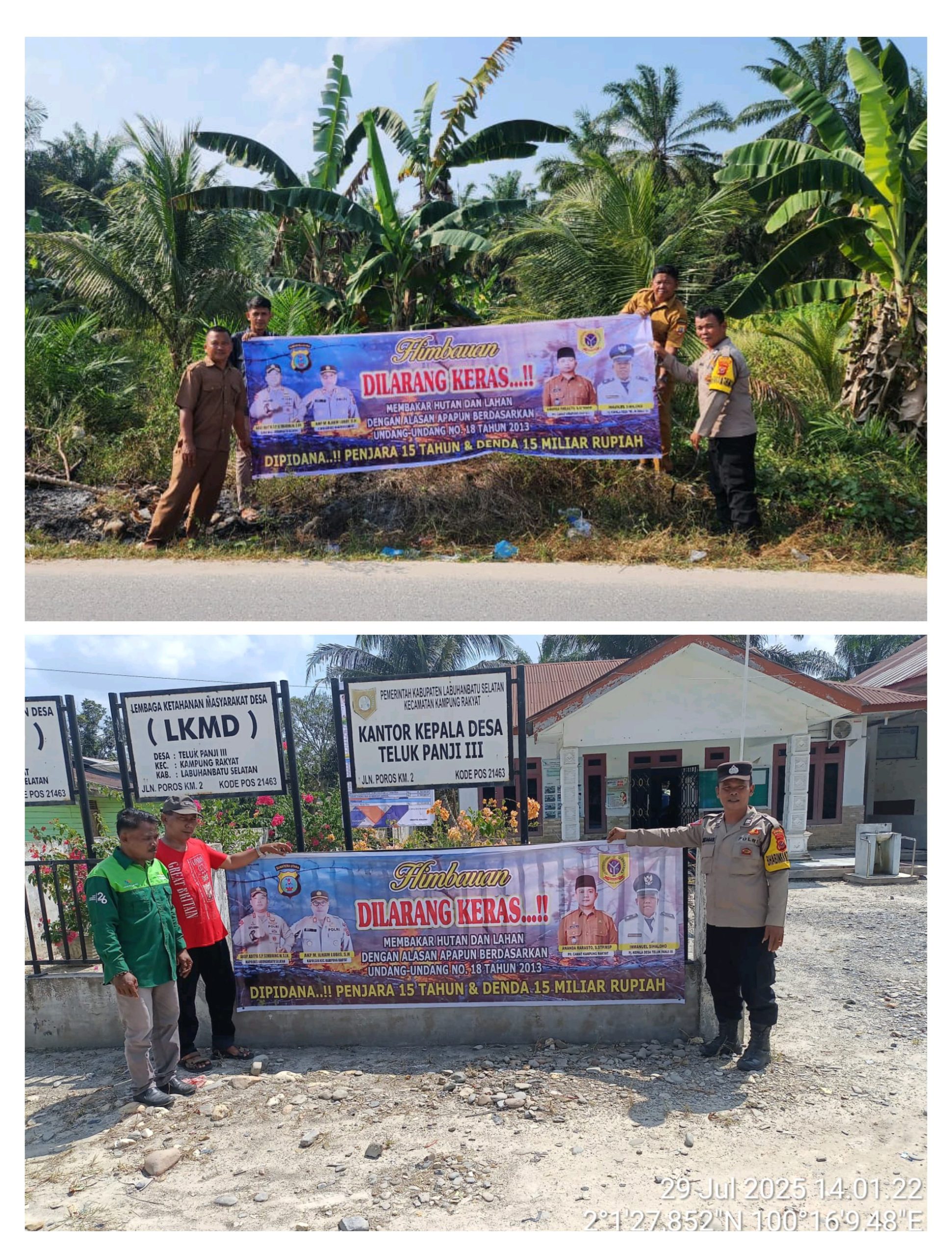 Dalam rangka menjaga situasi keamanan dan ketertiban masyarakat (Kamtibmas) tetap kondusif, Bhabinkamtibmas Polsek Kampung Rakyat, Polres Labuhanbatu Selatan, AIPTU Managor Hutagaol, melaksanakan kegiatan Cooling System, sambang, dan pemasangan spanduk imbauan di wilayah Kantor Desa Teluk Panji IV, Kecamatan Kampung Rakyat, Kabupaten Labuhanbatu Selatan, pada Selasa (29/7/2025).