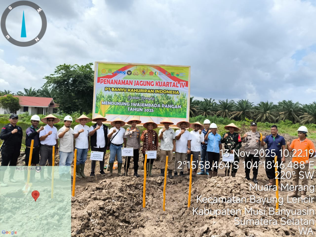 Dalam upaya mendukung program ketahanan pangan nasional, Kapolsek Lalan IPTU Syazili, S.H, Unsur Forkopimda bersama PT. Banyu Kahuripan Indonesia (BKI) melaksanakan kegiatan penanaman jagung Kuartal IV yang berlangsung pada Kamis pagi sekitar pukul 10.00 WIB hingga selesai. Kegiatan ini berlokasi di lahan perkebunan milik PT. BKI di Desa Karang Agung, Kecamatan Lalan, Kabupaten Musi Banyuasin, dengan luas area tanam sekitar 5 hektare pada titik koordinat -2°15’58,464″S, 104°18’46,488″E (220°SW).Kamis (13/11/2025).
