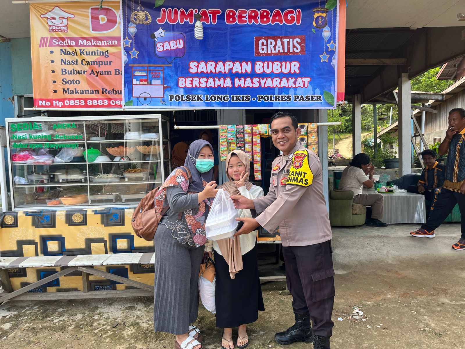 Polsek Long Ikis kembali menggelar program sosial Jumat Berbagi dengan membagikan sarapan bubur gratis kepada warga di Desa Atang Pait, Kecamatan Long Ikis, Kabupaten Paser, Jumat (5/12/2025). Kegiatan yang memasuki minggu ke-12 ini berlangsung di Warung Bubur RT 002 mulai pukul 08.45 Wita.