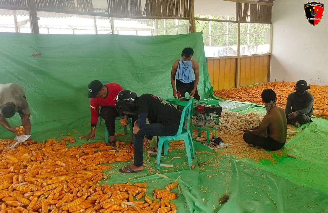 Dalam pelaksanaan kegiatan, personel Polsek Mukok menggunakan mesin pipil jagung guna mempercepat proses pemisahan biji jagung dari tongkolnya.