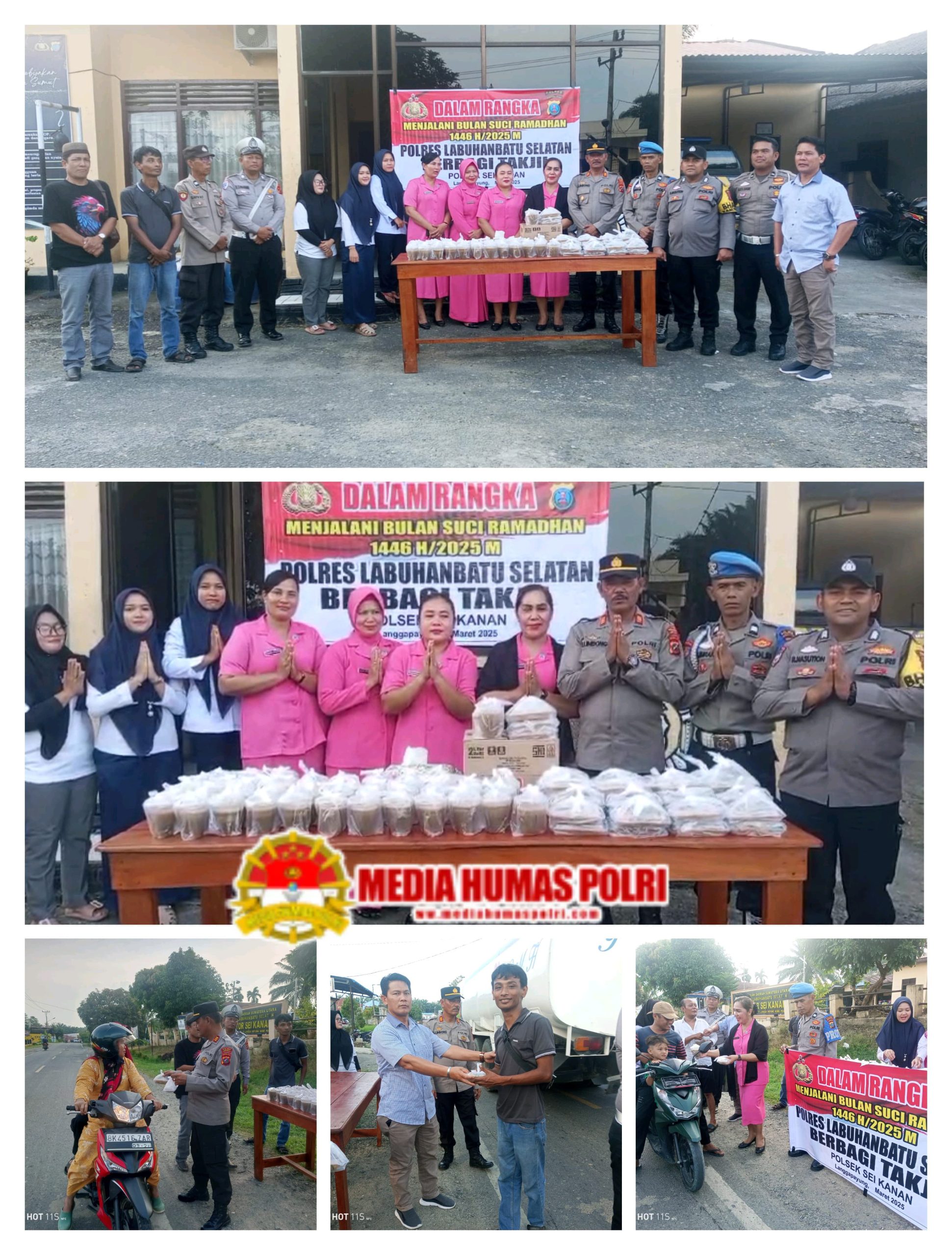 Dalam rangka menjalani bulan suci Ramadhan 1446 H/2025 M, Polres Labuhanbatu Selatan melalui Polsek Sei Kanan melaksanakan kegiatan sosial berbagi takjil kepada masyarakat yang melintas di Jalinsum Langgapayung, tepatnya di depan Polsek Sei Kanan, jalan lintas Sumatera Kotapinang-Gunung Tua, Kelurahan Langga Payung, Kecamatan Sungai Kanan, Kabupaten Labuhanbatu Selatan, pada Senin (10/3/2025) pukul 17.00 WIB.