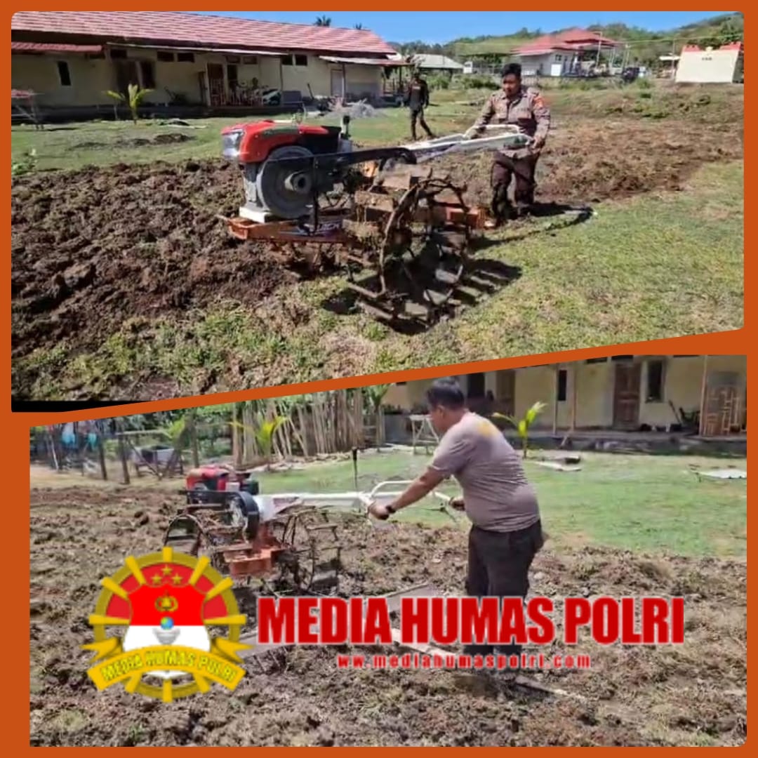 Polsek Sekongkang Polres Sumbawa Barat mulai mengolah lahan yang ada di belakang Mapolsek dengan membajak menggunakan hand tracktor, Sabtu (2/11/2024).